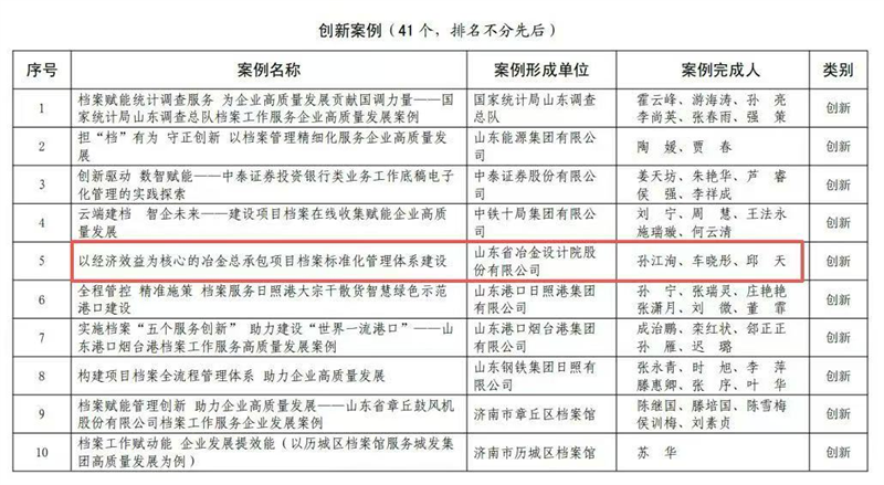 該案例榮獲此獎項,不僅表明山冶設(shè)計在檔案建設(shè)模式方面取得的成果獲得了省內(nèi)檔案專家的高度認可與肯定,還充分彰顯出公司在全省范圍內(nèi)企業(yè)檔案管理工作領(lǐng)域處于領(lǐng)先地位,具有一定的專業(yè)示范作用和引領(lǐng)價值,能夠為其他企業(yè)在檔案管理方面提供有益的借鑒。檔案建設(shè)模式在眾多企業(yè)中嶄露頭角,其創(chuàng)新性、科學性和實用性成為行業(yè)標桿,這無疑進一步提升了山冶設(shè)計在業(yè)界的聲譽和影響力。